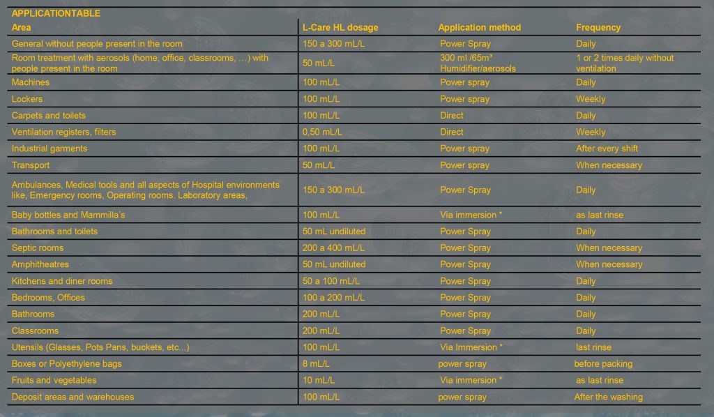 Human hands are a reservoir for potential harmful micro-organisms. This document describes the efficiency of the product ‘L-care’ from Limit Group (nv Aalst). In a first experiment we test the efficiency of cleaning the hands from bacteria and fungi with the aid of a small sized sterilizer. We report 100% cleaning of the hands from bacteria and fungi after short exposure to humidified 10% (v/v in water) L-care. In a second experiment we test the efficiency of the same small sized sterilizer with 10% (v/v in water) L-care on killing contaminants from the air in a common office room. We see a drastic reduction of potential harmful bacteria or fungi from the air up to 100% after 1h and even 24h after the treatment of the room. For all experiments, no accumulation of gaseous ClO2 was detected during or after the humidification process.